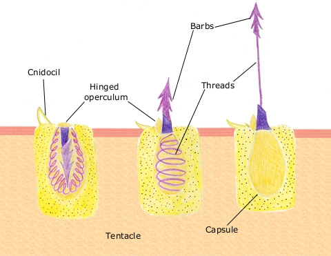 - Cnidocysts or nematocysts are structures found in specialized cells (cnidocytes) typical of the phylum Cnidaria (jellyfish, hydrae, sea anemones, etc.). Cnidocytes concentrate calcium ions that raise the osmotic pressure inside the cell, recalling water that quickly fills it and violently expels a sort of harpoon with an acceleration up to 40 000 g. The nematocyst is used to inoculate venom, but other cnidocytes have structures to stick to preys with an adhesive coating (ptychocysts) or to wrap around them with a string (spirocysts). Nematocyst venom can be extremely painful and quickly lethal even to large-sized organisms.