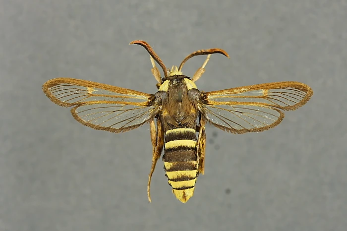 Sesia apiformis displays its remarkable resemblance to a wasp.