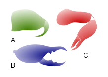 Three types of chelicerae: jackknife (A), scissor (B), three-segmented chela