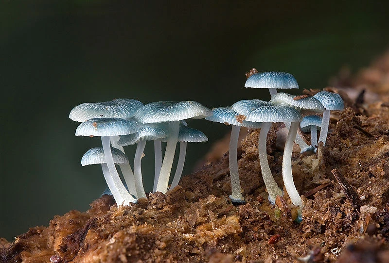 The mushroom Mycena interrupta growing on detritus.